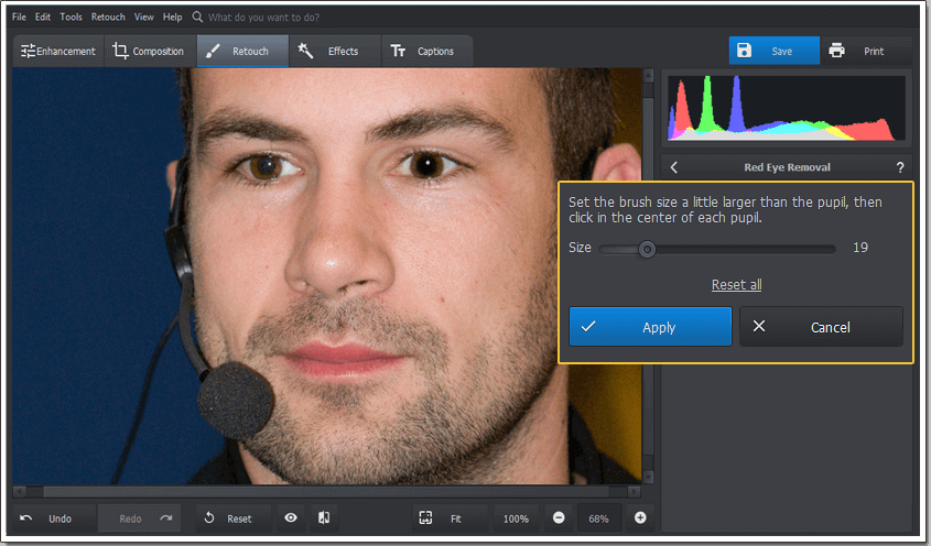 Folosind software-ul de retușare portret, mascați imperfecțiunile pielii, cum ar fi gropițe, pistrui, pungi sub ochi sau riduri. De exemplu, eliminarea ochilor roșii va fi utilă dacă trebuie să ștergeți o strălucire înfricoșătoare cauzată de un bliț al camerei plasat prea aproape de fața subiectului. Așezați pensula peste pupila roșie și programul îi va restabili automat culoarea naturală.