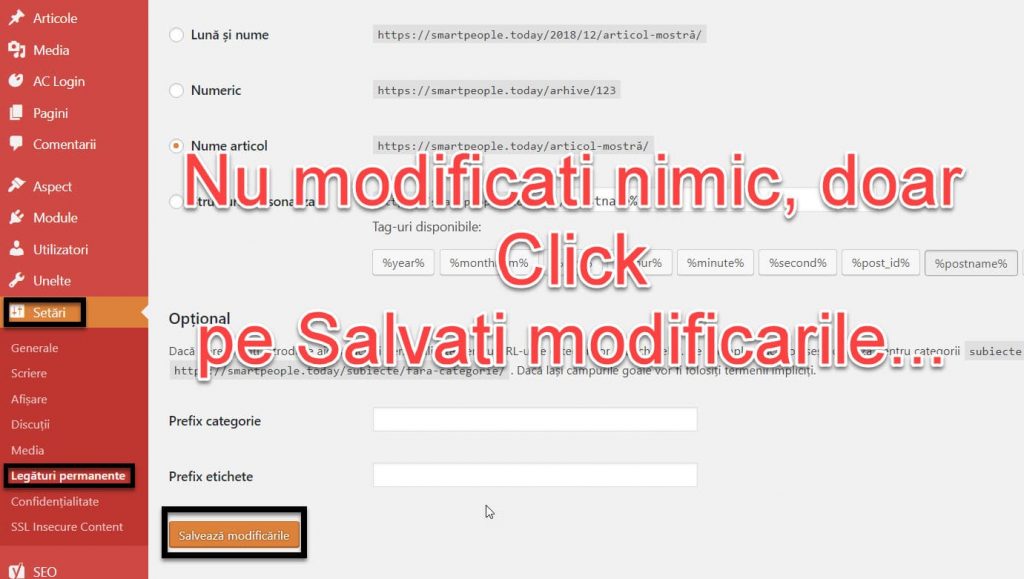 Cu toate acestea, este posibil ca WordPress sa nu poata localiza fisierele din cauza lipsei fisierului .htaccess din dosarul radacina. In acest caz, mergeti la pagina “Setari/Legaturi permanente” din Panoul de Administrare WordPress si faceti clic pe butonul “Salvati modificarile” pentru a regenera fisierul .htaccess.