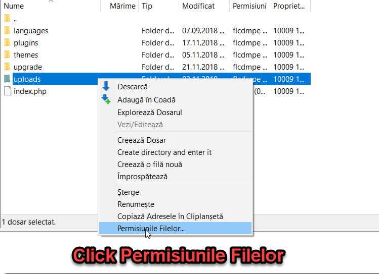 Conectati-va la site-ul dvs. folosind clientul FTP si apoi accesati directorul / wp-content /. Acolo veti vedea folderul / incarcari / ( uploads ). Faceti clic dreapta pe directorul de incarcari si selectati permisiunile filelor.