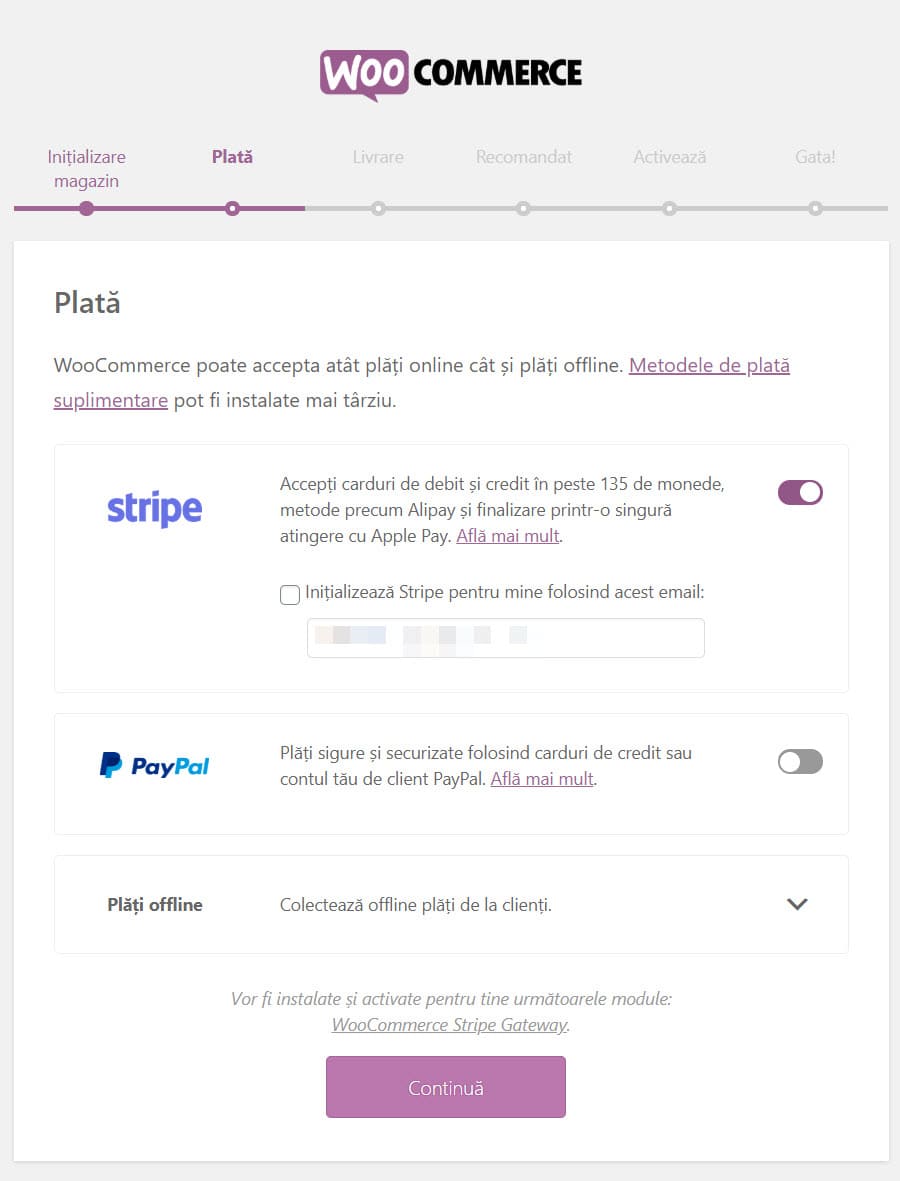 Alegeți modul în care doriți să fiți plătit prin butoanele glisante pornite / oprite. Toate gateway-urile de plată oferite în Expertul de Configurare WooCommerce sunt pluginuri gratuite care sunt instalate și activate automat, dacă sunt selectate. *