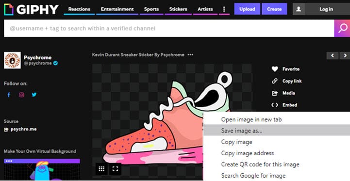 • Vizitați giphy.com pentru a găsi orice autocolant care vă place și faceți clic dreapta pe mouse pentru a-l salva ca GIF.