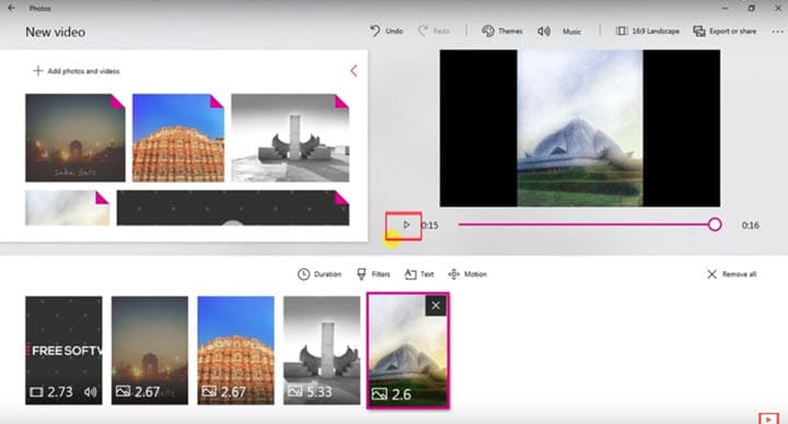 Microsoft Photos are un editor video ascuns. Puteți face clic pe videoclipul din biblioteca foto și puteți crea un proiect video. Nu este un editor bazat pe cronologie și folosește în schimb storyboard-uri. Dacă doriți o editare rapidă și ușoară, această aplicație este calea de urmat. Puteți adăuga mai multe clipuri video, adăuga text, aplica mișcări și adăuga muzică de fundal la clip.
