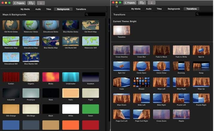 Pentru utilizatorii de Mac, iMovie este cea mai bună alternativă gratuită la InShot pentru PC. Este intuitiv să tăiați videoclipul fără o curbă abruptă de învățare. Dacă vii dintr-un fundal de editare mobil, nu te vei simți intimidat de iMovie. După ce ați importat materialul, muzica și imaginile în My Media, puteți trage media în cronologie. Există douăzeci și ceva de tranziții gratuite de utilizat între clipuri și sunt acceptate și fundalurile de culoare pură.