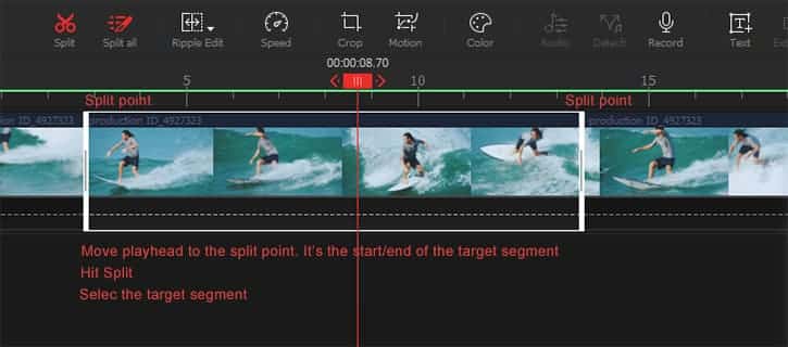 Să selectăm videoclipul țintă în Cronologie > faceți clic pe pictograma Redare din panoul de pre-vizualizare. După aceea, capul de redare roșu se va muta în Cronologie pentru a pre-vizualiza videoclipul > apăsați pictograma Oprire din Cronologie pentru a localiza punctul de pornire în care doriți să adăugați Zoom. Atingeți Split în Bara de instrumente. Apoi, împărțiți punctul final în care doriți să adăugați zoom în același mod. Acum obțineți segmentul pentru zoom.