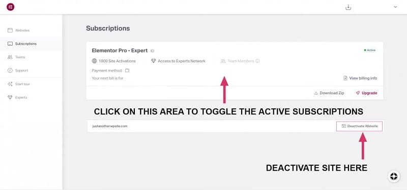 În contul dvs. Elementor Pro, faceți clic pe Abonamente în bara laterală din stânga. Găsiți abonamentul în lista care se afișează și faceți clic pe titlul abonamentului pentru a vedea detaliile acestuia. Derulați în jos până la lista de site-uri web conectate.
