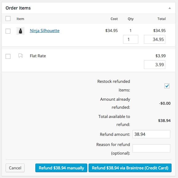 PayPal Powered by Braintree are suport automat pentru rambursare. Aceasta înseamnă că rambursările pot fi procesate direct în WooCommerce fără ca comerciantul să se conecteze într-un cont Braintree. Rambursările sunt acceptate atât pentru cardurile de credit, cât și pentru gateway-urile PayPal.