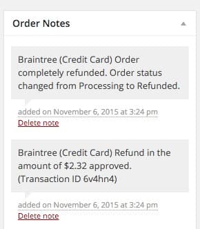 În schimb, aceasta va anula taxa autorizată în Braintree și va nota că taxa este anulată prin intermediul notei de comandă. Rețineți că WooCommerce va afișa în continuare „Rambursarea prin card de credit” ca text pentru anularea unei tranzacții încă – acest lucru este normal.