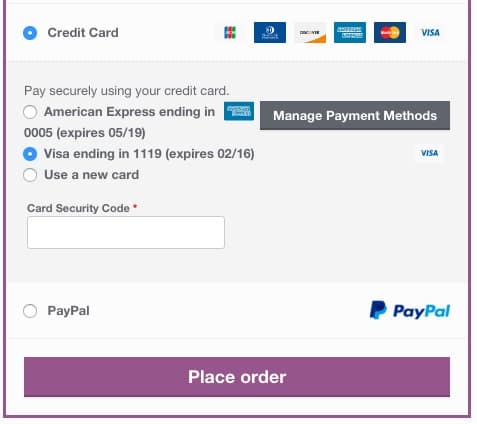 Clienții își pot gestiona metodele de plată salvate accesând pagina Contului meu și derulând la secțiunea „Metode de plată”. De aici pot seta orice metodă de plată salvată disponibilă ca activă sau pot face clic pe acțiunea „Șterge” pentru a șterge metoda de plată.
