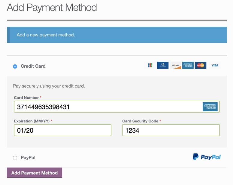 Clienții pot să adauge carduri sau să conecteze conturi PayPal făcând clic pe „Adaugă metoda de plată”. Acest lucru le va oferi un formular pentru a salva în siguranță o metodă de plată pentru o utilizare viitoare, fără a trece prin procesul de finalizare.