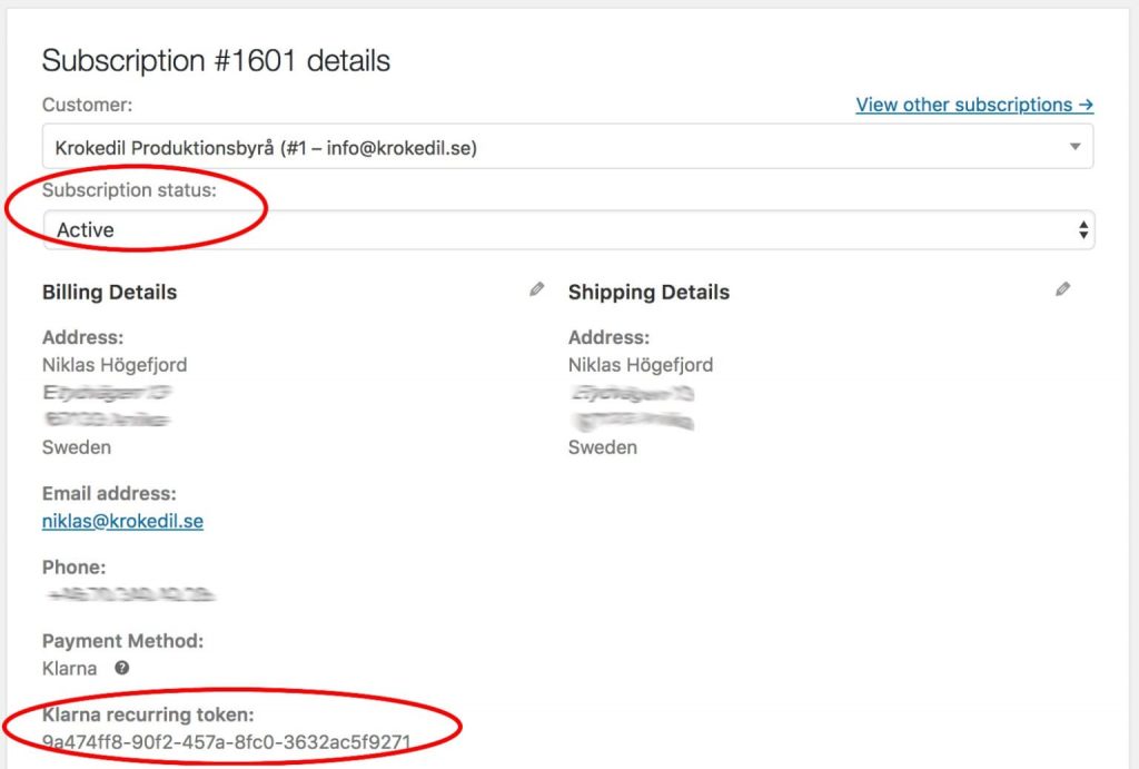 - Așteptați 24 de ore și verificați dacă s-a creat comanda de reînnoire, se adaugă un nou număr de rezervare de la Klarna la notele de comandă din comanda de reînnoire, iar abonamentul este din nou activat.