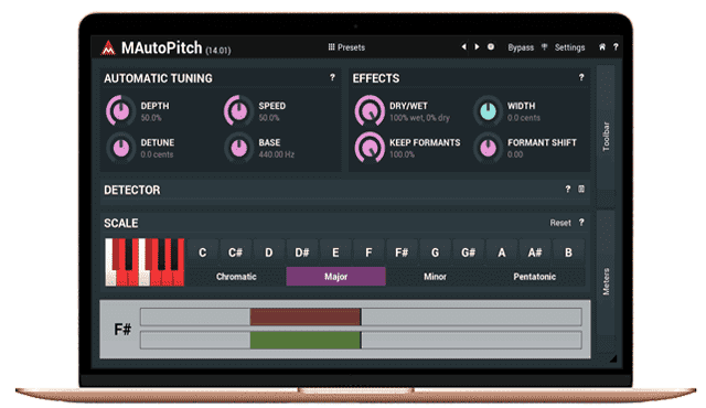 MAutoPitch este unul dintre cele mai bune plug-in-uri VST de autotune gratuite oferite de MeldaProduction, indiferent dacă aveți nevoie de o corecție subtilă a tonului vocal sau a efectelor audio artificiale.