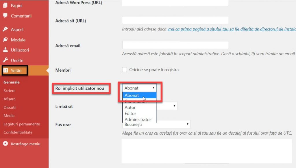 Pentru a adauga utilizatori si roluri utilizator la WordPress, conectati-va la tabloul de bord WordPress si din meniul din stanga selectati Utilizatori / Adauga utilizator. In noua interfata aveti un formular de completat. Alegeti rolul lor in caseta / Rol implicit utilizator nou.