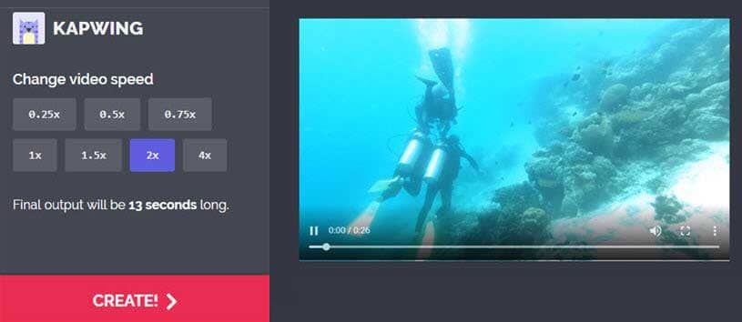Similar cu Ezgif, Kapwing este, de asemenea, o platformă online de editare a imaginilor, videoclipurilor și GIF. Instrumentele sale includ generator de video, generator de meme, editor de subtitrare, adăugare de sunet la video și GIF, redimensionare video, eliminarea fundalului din imagine, decuparea videoclipului, adăugarea de imagini la video, adăugarea barei de progres la video, schimbătorul de viteză video și multe altele. În cadrul instrumentului său de schimbare a vitezei video, puteți personaliza viteza originală de redare a videoclipurilor de la 0,25x la 4x.