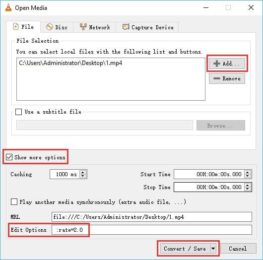 Pasul 3. În Opțiuni de editare, introduceți codul :rate=2.0, ceea ce înseamnă că permiteți VLC să modifice viteza video de 2 ori mai rapid decât cea originală. Cu siguranță, dacă doriți o altă opțiune de viteză video, schimbați doar numărul, de exemplu, :rate=0.5, de 2 ori mai mică decât viteza inițială. În cele din urmă, faceți clic pe butonul Convertiți/Salvați.