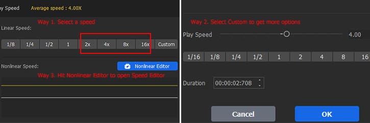 Dacă niciunul dintre ele nu vă face fericit, puteți da clic pe Personalizat pentru mai multe opțiuni. Sau puteți să faceți clic pe Editorul neliniar pentru mai multe opțiuni amuzante despre creșterea vitezei sale.