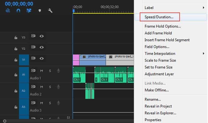 Pasul 3: Creați o nouă secvență, trageți videoclipul în panoul Cronologie, faceți clic dreapta pe clipul video și găsiți opțiunea „Viteză/Durată”.