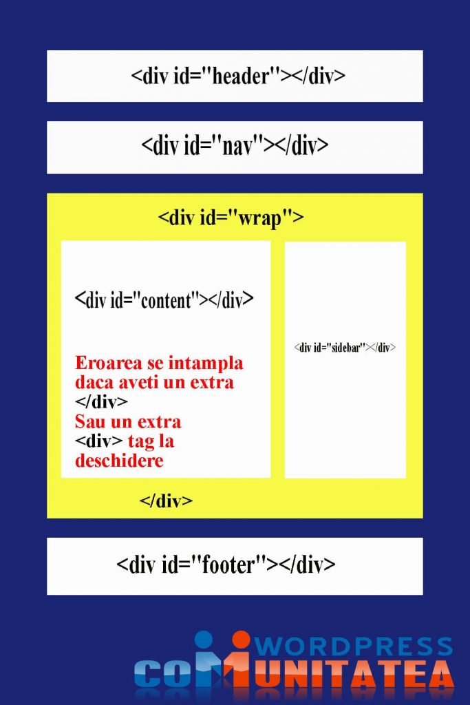 Din 9 cazuri din 10 cu Sidebar Error , motivul este acelasi. Exista un element Div divizat pe pagina. Ar putea fi un element extra div care este inchis pe pagina, ceea ce face sa para ca bara laterala este in afara elementului. Ce inseamna asta in limba romana? Sa o rezolvam pas cu pas.