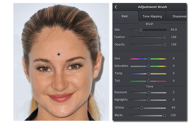 Încă o dată, să folosim Pensula de ajustare ( Adjustment Brush ) pentru a scăpa de strălucirea din fotografie. Mutați glisorul de dimensiune la 40, feather și opacity ar trebui să fie de 100. Cu pensula, vopsiți peste zona frunții unde a fost îndepărtată strălucirea. Reglați tonul selecției: setați nivelul de expunere ( exposure level ) la 2, umbrele ( shadows ) la 40, albii ( whites ) la -40 și negrii ( blacks ) la 100.
