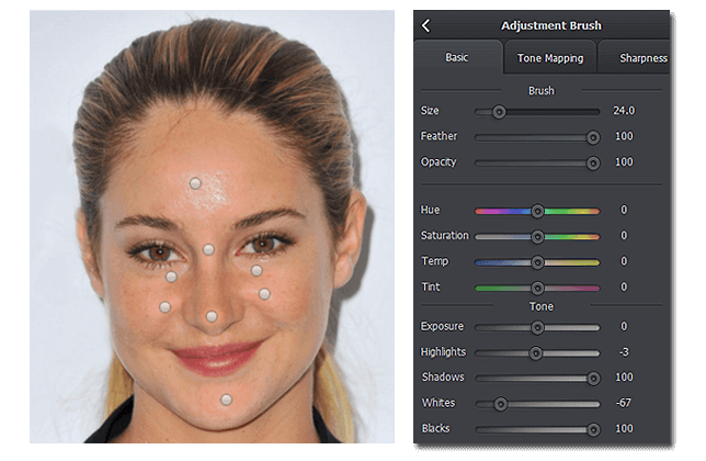 Mutați la fila Retușare ( Retouch ) și selectați opțiunea Adjustment Brush. În fila Setări de bază ( Basic settings ), setați dimensiunea pensulei la 24. Vopsiți peste strălucirea blițului cu Adjustment Brush. Schimbați setările regiunii selectate: mutați glisorul de evidențiere la -3, alegeți 100 pentru umbre și negru -67 pentru alb. Eliminați strălucirile de pe nasul fetei, obrajii, bărbia și zonele de sub ochi în același mod.