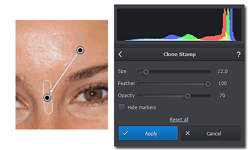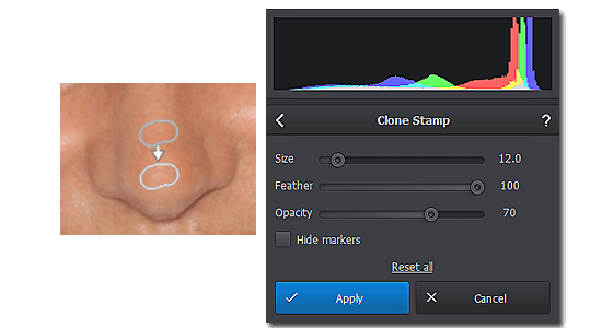 Pentru a elimina complet strălucirea imaginii, reveniți la fila Retușare ( Retouch ) și alegeți Clone Stamp. Setați dimensiunea sculei la 12 și opacitatea sa la 70. Vopsiți peste strălucirea nasului și selectați sursa de clonare. Alegeți o zonă gradată similar, astfel încât fața să arate natural după editare.