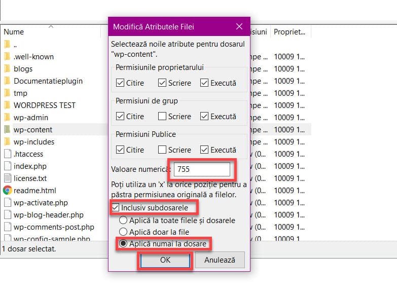 Clientul dvs. FTP va seta acum permisiunile folderului la 755 si il va aplica tuturor sub-dosarelor din interiorul folderului wp-content.