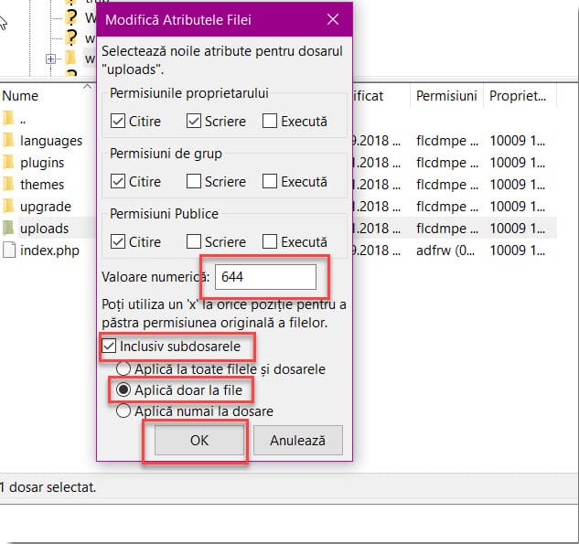Introduceți 644 in valoarea numerica si apoi bifati caseta de langă “Inclusiv subdosarele“.