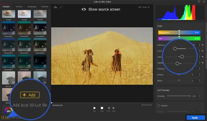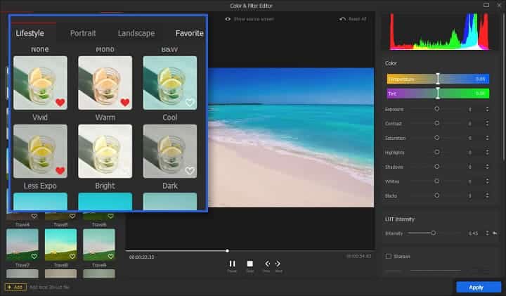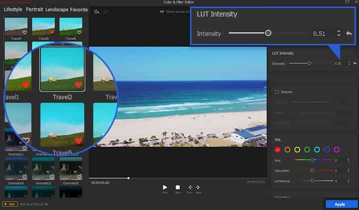 Pasul 3 – Găsiți LUT 3D în Favorite și faceți clic pe Aplicare culoare pentru a aplica videoclipului.