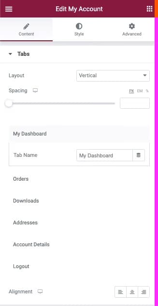 Personalizați pagina contului WooCommerce cu Widge-tul WooCommerce My Account Widget. Schimbați aspectul, numele filelor, alinierea filelor, precum și culorile și fonturile. Când publicați, vi se va solicita să atribuiți automat această pagină ca pagina implicită Contul meu în setările WooCommerce.