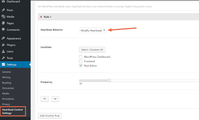 Odată ce instalați și activați pluginul, accesați Setări → Heartbeat Control pentru a reduce sau dezactiva API-ul Heartbeat pentru diferite zone ale tabloului de bord: