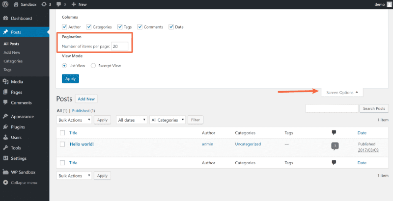 Prin setările Opțiuni pentru ecran, WordPress vă permite să controlați câte postări, pagini sau tipuri de postări personalizate să fie afișate simultan (inclusiv lucruri precum produse WooCommerce, comenzi etc.):