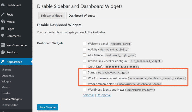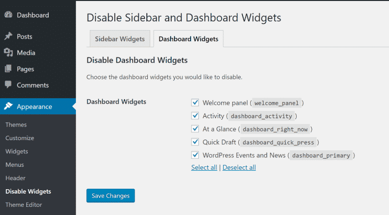 Pentru a dezactiva widget-urile inutile, puteți utiliza pluginul gratuit Widget Disable.