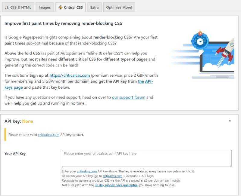 Acest lucru ne aduce la CSS critice („C” cu majuscule), care este un serviciu cu plată care vă ajută să detectați automat și cu precizie CSS critice („c„ cu literă mică), de la o pagină la alta. Dacă sunteți dispus să plătiți pentru serviciul CSS critic, Autoptimize vă permite să vă integrați cu serviciul respectiv în această filă.