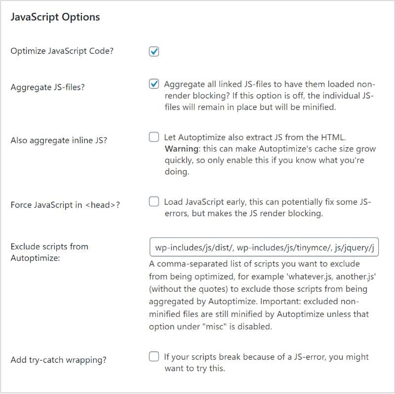 Dacă întâmpinați erori, vă puteți juca cu opțiunile pentru a forța JavaScript în <head> sau add try-catch wrapping – doar acordați atenție avertismentelor.