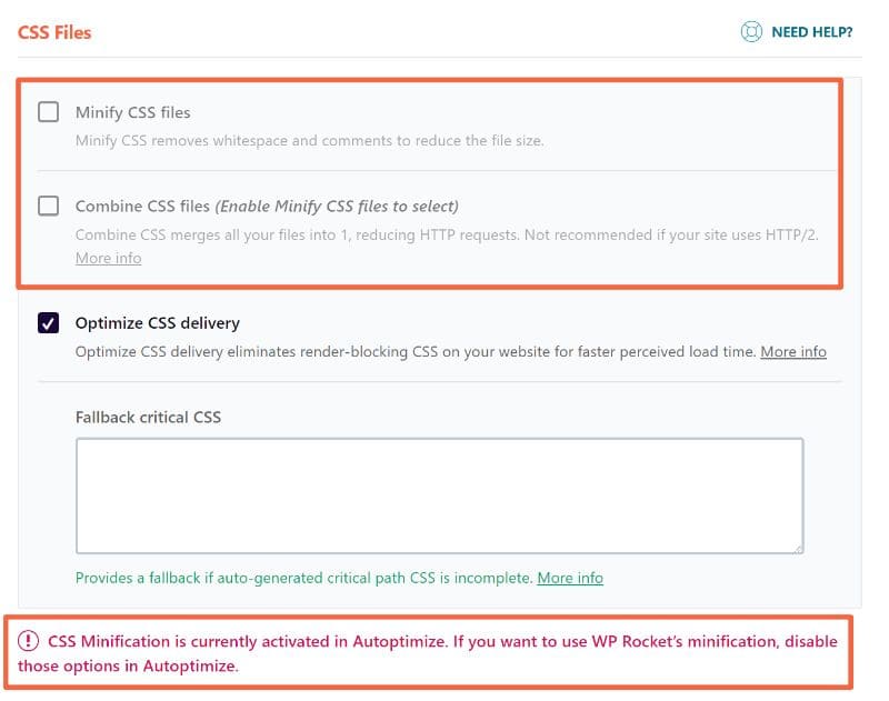 În plus, WP Rocket include unele caracteristici pentru optimizarea codului. De exemplu, WP Rocket vă poate ajuta să vă minimizați CSS și JavaScript și include câteva caracteristici de concatenare, astfel încât există unele suprapuneri între caracteristicile din WP Rocket și Autoptimize.